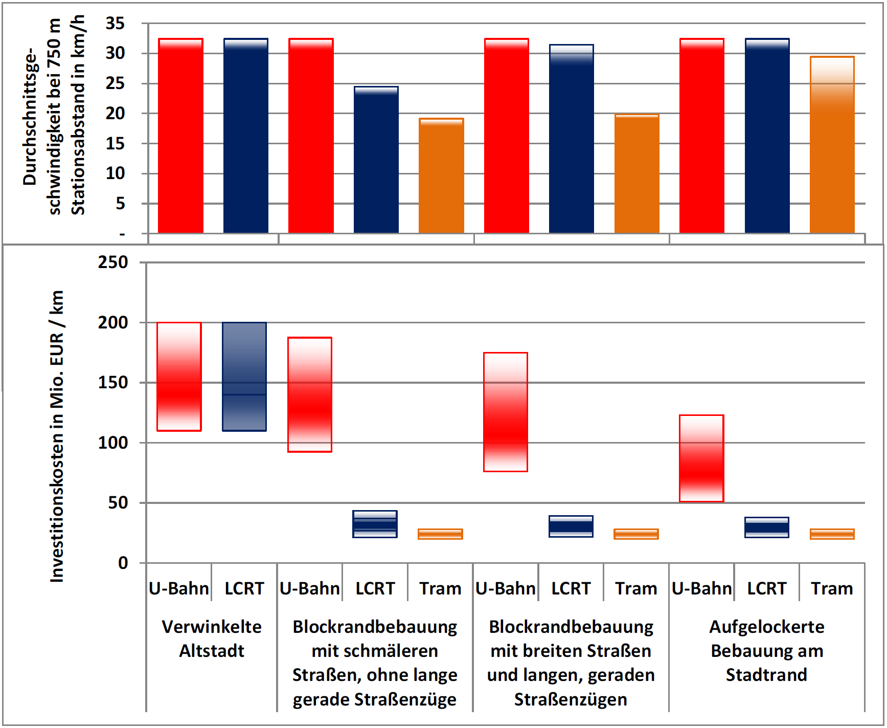 Das ideale Einsatzgebiet für LCRT ist die klassische Blockrandbebauung mit breiteren Straßen, hier kann die größte Verbesserung im Verhältnis von Kosten und Qualität erzielt werden. Näher am Zentrum steigen zwar die Kosten etwas an und die Geschwindigkeit geht zurück, ähnlich verschlechtern sich aber auch die Kosten konventioneller U-Bahnen und die Geschwindigkeit der konventionellen Straßenbahn. Sofern LCRT die historische Altstadt nicht umfährt, kann sie nur mit konventioneller Tunnelbauweise zu U-Bahn-ähnlichen Kosten unterquert werden. Umgekehrt kann am Stadtrand eine konventionelle Schnellstraßenbahn eine gewisse Alternative darstellen.