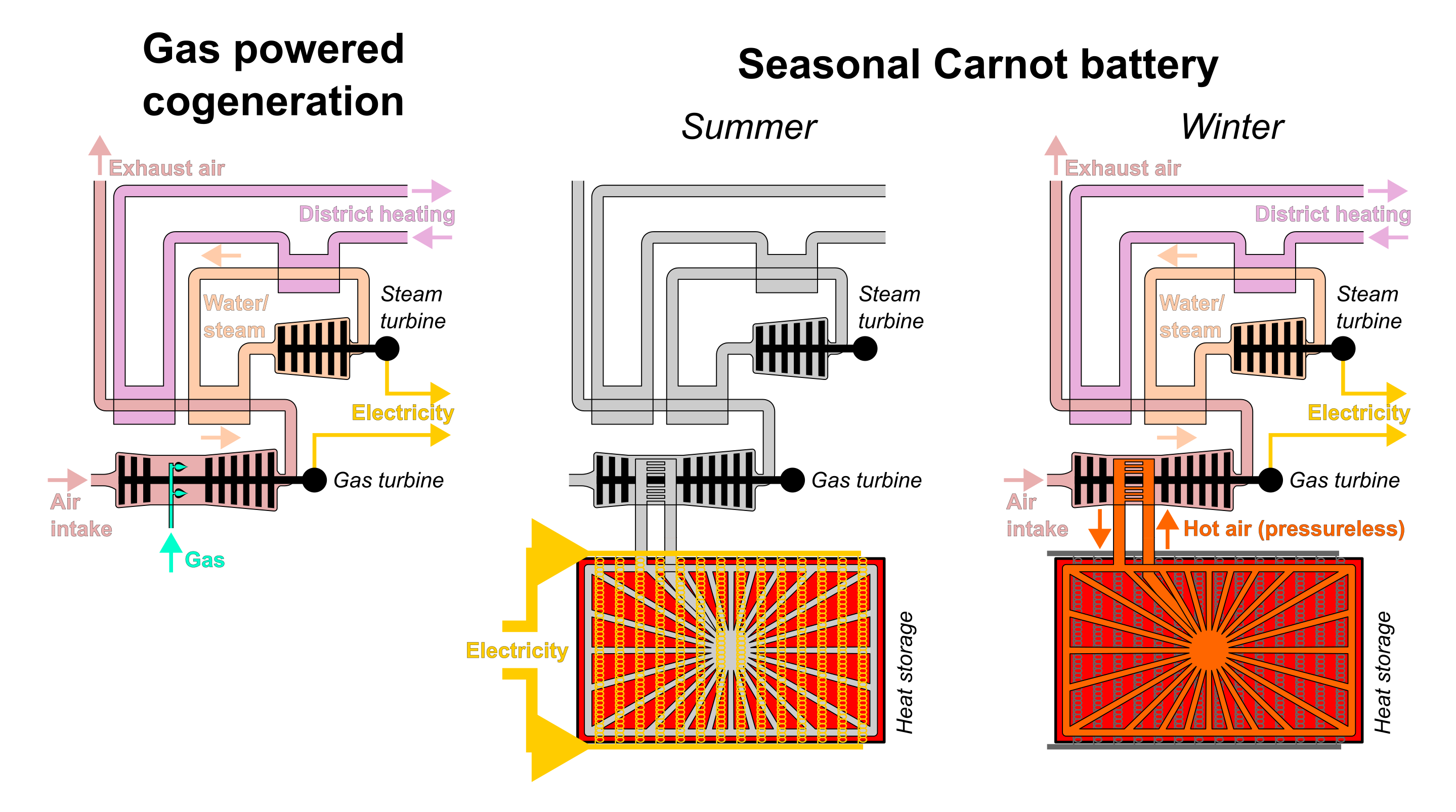 A plant of relatively similar characteristics except size and storage duration has been examined within the "High-T-Stor" project by the Universities of Applied Sciences Mittelhessen. The heat storage unit of this project is nearly a cube of about 2,4 m side length and consists out of ceramic bricks which can be heated up to 1200 °C, the insulation layer is about 60 cm. This storage looses roughly 5% of the stored heat per day. For reconversion of heat into electricity, a gas turbine cycle with external heating is applied: Air is blown through the heat storage and the heat from that air is transferred to the compressed air of the gas turbine cycle by a heat exchanger. Introducing compressed air or steam directly into the heat storage wouldn't be manageable from a process engineering point of view. Waste heat of this gar turbine cycle is used for district heating.