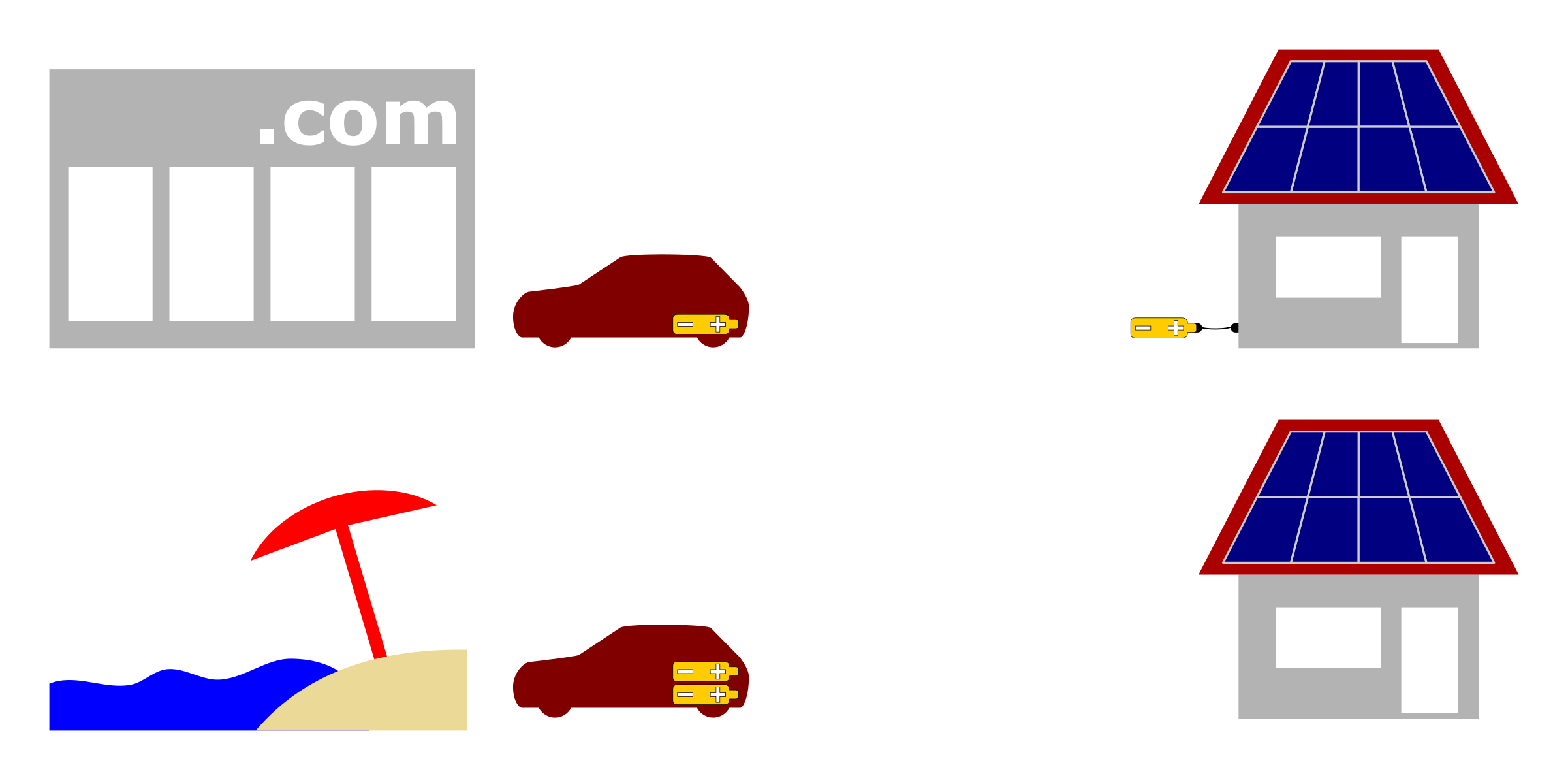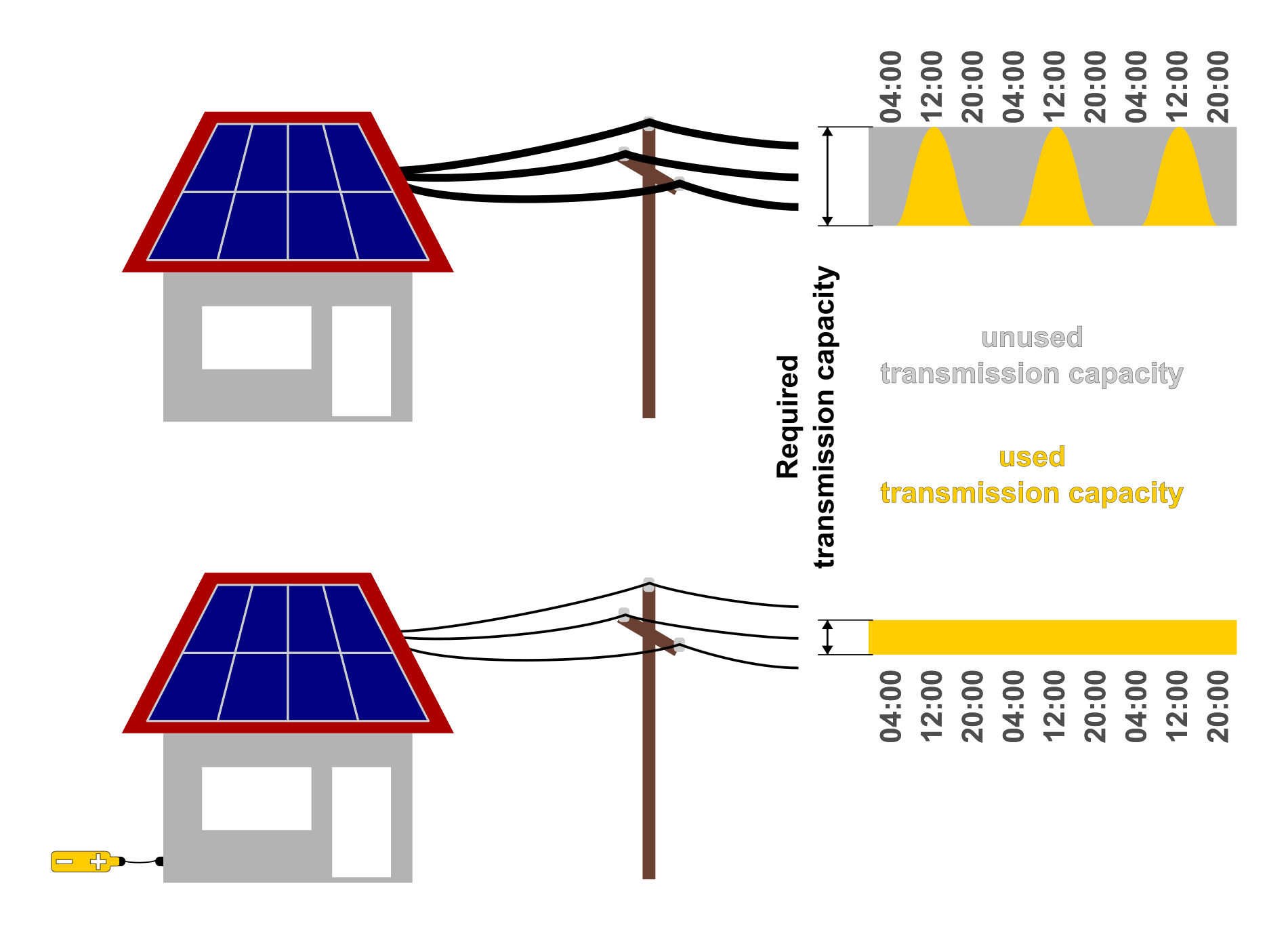 The target group of this solution are people living in an area of lower residential density but high potential for photovoltaics (e.g. residential areas consisting out of single-family homes) and commuting either directly into an urban area or to a park-&-ride facility. In such a situation, conventional electric cars with permanently installed batteries can hardly contribute to the relief of local power grids by reverse charging because around noon, when there is the maximum electricity generation by photovoltaics, these cars are not at home next to the photovoltaic system, but in a city or on a park-&-ride facility. Compared to other ways of reversed charging, leaving a part of the battery capacity at home has the advantage of avoiding additional contractual relationships between the car owner and different electricity suppliers buying and selling electricity at different time and locations. Instead, self-consumption is optimized and feed-in to the power grid is flattened.