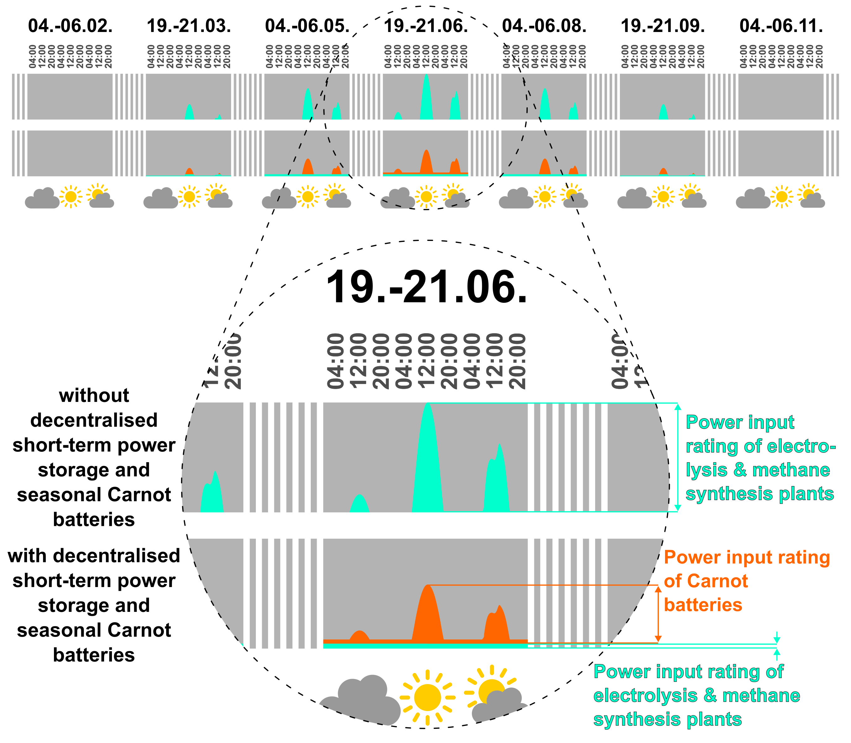Uneconomic temporal utilisation characteristics can concern not only electricity grids: If most of photovoltaic surplus generation would be used for production of e-fuels and synthetic methane, these energy conversion plants would also have very few full-load hours per year. It would be necessary to dimension these plants for the electricity surplus of summer noon peaks, but even in summer, most hours of the day they would by far not be fully utilized. This would heavily affect the profitability of these plants, which are still just in a phase of development and require expensive, rare materials like platinum or palladium for electrodes and catalytic surfaces. The demand for these plants and materials can be significantly reduced if synthetic methane and other synthetic hydrocarbons are produced only to the extent required in the chemical sector, for navigation and for aviation and if photovoltaic electricity generation is additionally buffered by decentralized storage for some hours and by big Carnot batteries for months: