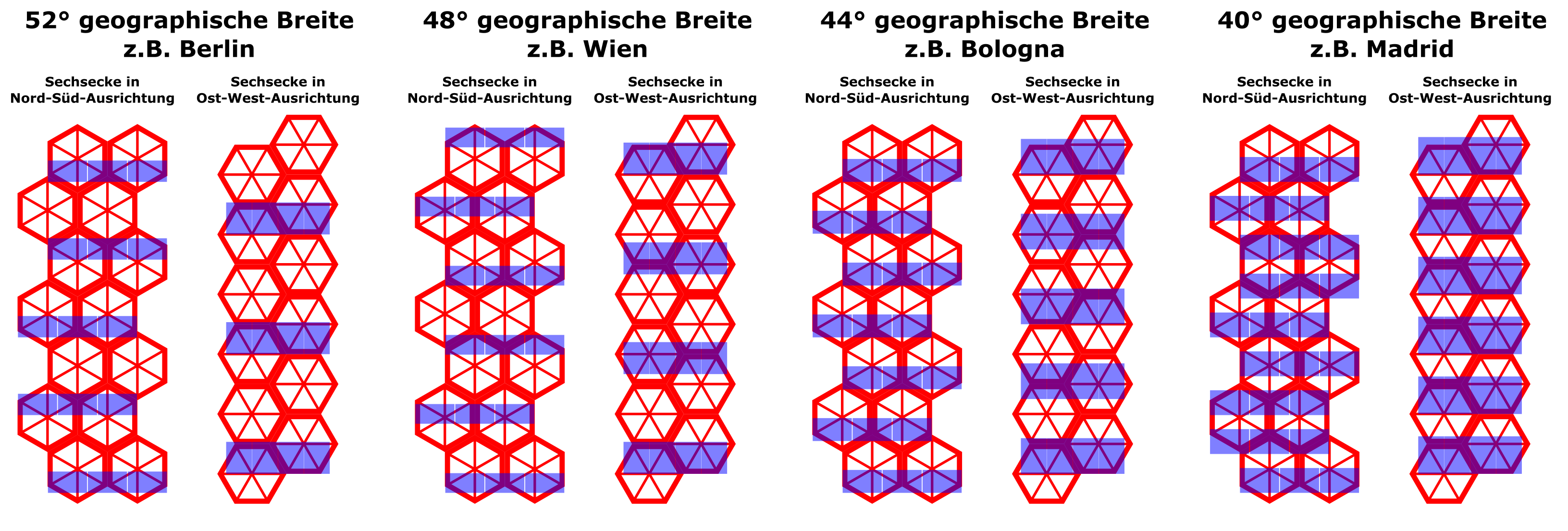 In Nord-Süd-Richtung sind die Verhältnisse von Panelabständen und Sechseckabständen von der geographischen Breite abhängig: In den folgenden zwei Abbildungen sind für beide Ausrichtungen der Panele (kurze oder lange Seite in Ost-West-Richtung) für verschiedene geographische Breiten in Europa Kombinationen von Panel-Neigung und Panel-Abständen dargestellt. Dabei kommt es auch beim niedrigsten Mittagssonnenstand des Jahres (schwarz strichlierte Pfeile) zu keiner gegenseitige Verschattung der Panele und die beiden zwei nördlicheren Beispiele weisen mindestens 30° Neigung auf, damit Schnee zuverlässig abrutscht und mehr Winterertrag erreicht wird.