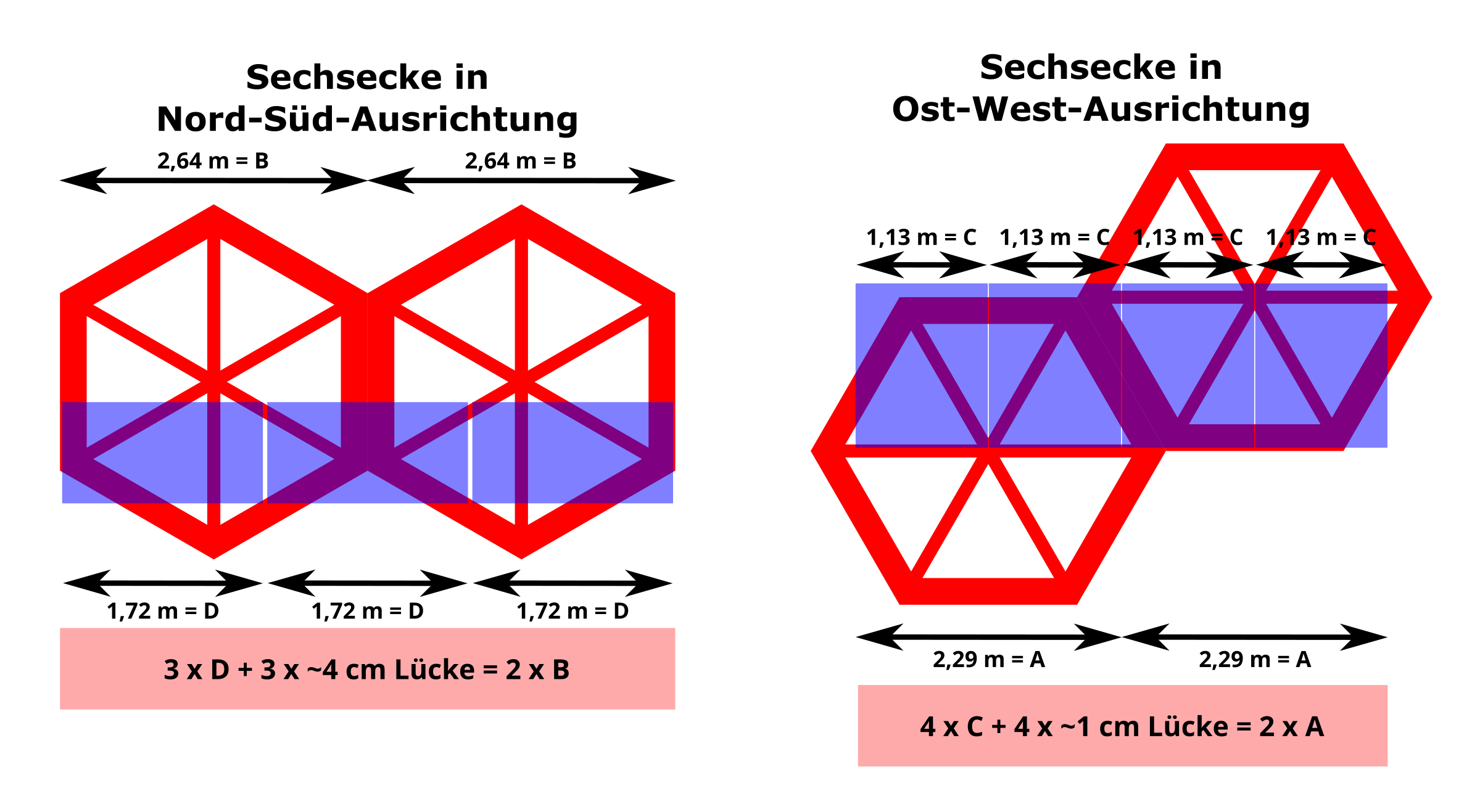 - Verlaufen stets zwei Kanten jedes Sechsecks in Nord-Süd-Richtung, so werden die Standard-Photovoltaikpanele (1,72 x 1,13 m) mit ihrer längeren Seite in Ost-West-Richtung angeordnet. Lässt man zwischen den Panelen jeweils eine Lücke von ca. 4 cm, so passen auf zwei Sechsecke genau drei Panele.