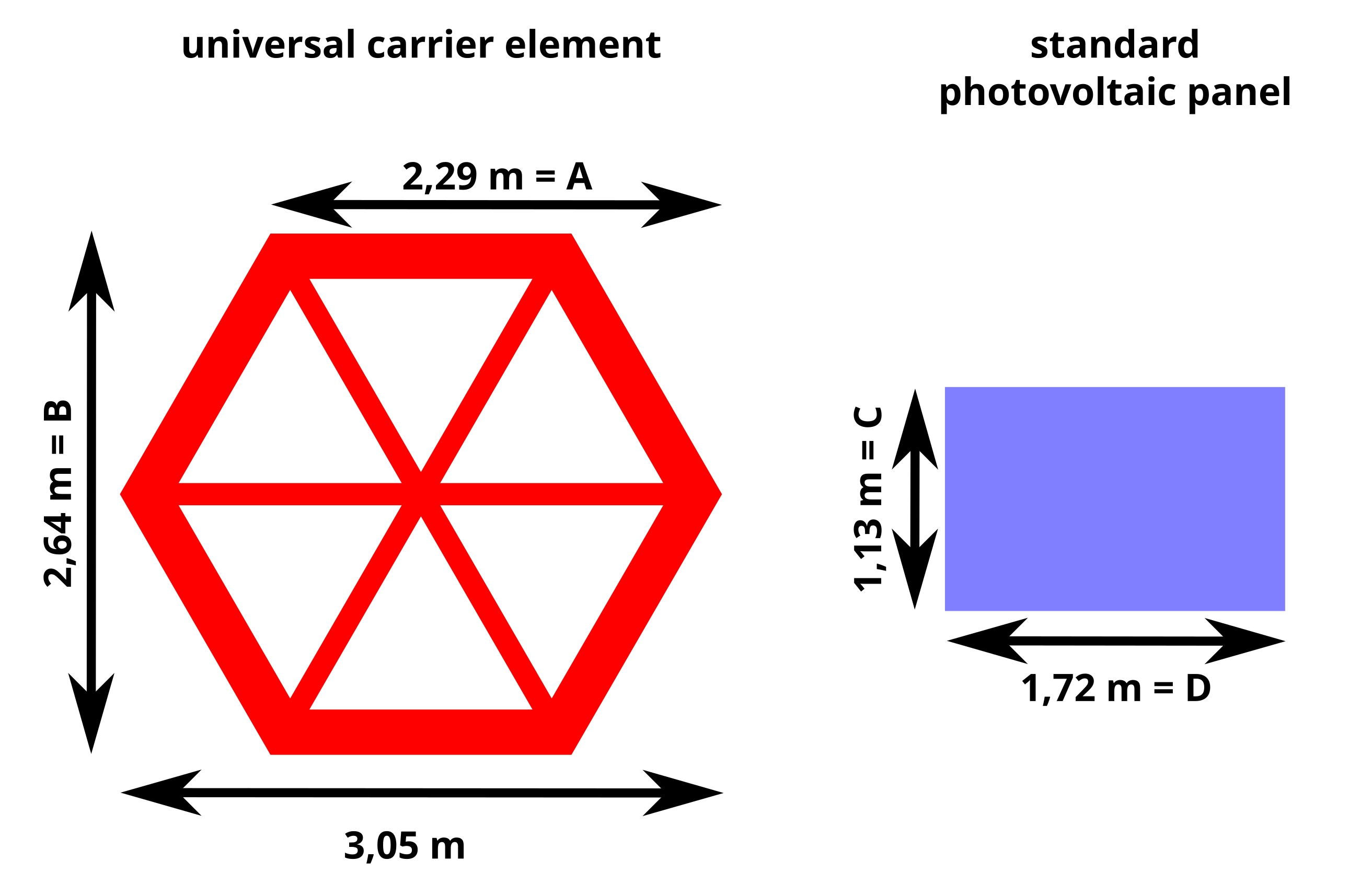 The proposed width between two parallel sides of the carrier elements is 2,64 m. This is too much for horizontal transport on a truck, but these hexagons can be accommodated vertically in a high-cube container or swap body. Exceeding the standard road vehicle width of 2,5 m is advantageous for application on carports, parking lots etc. with a common spacing of 2,5 m of passenger cars.