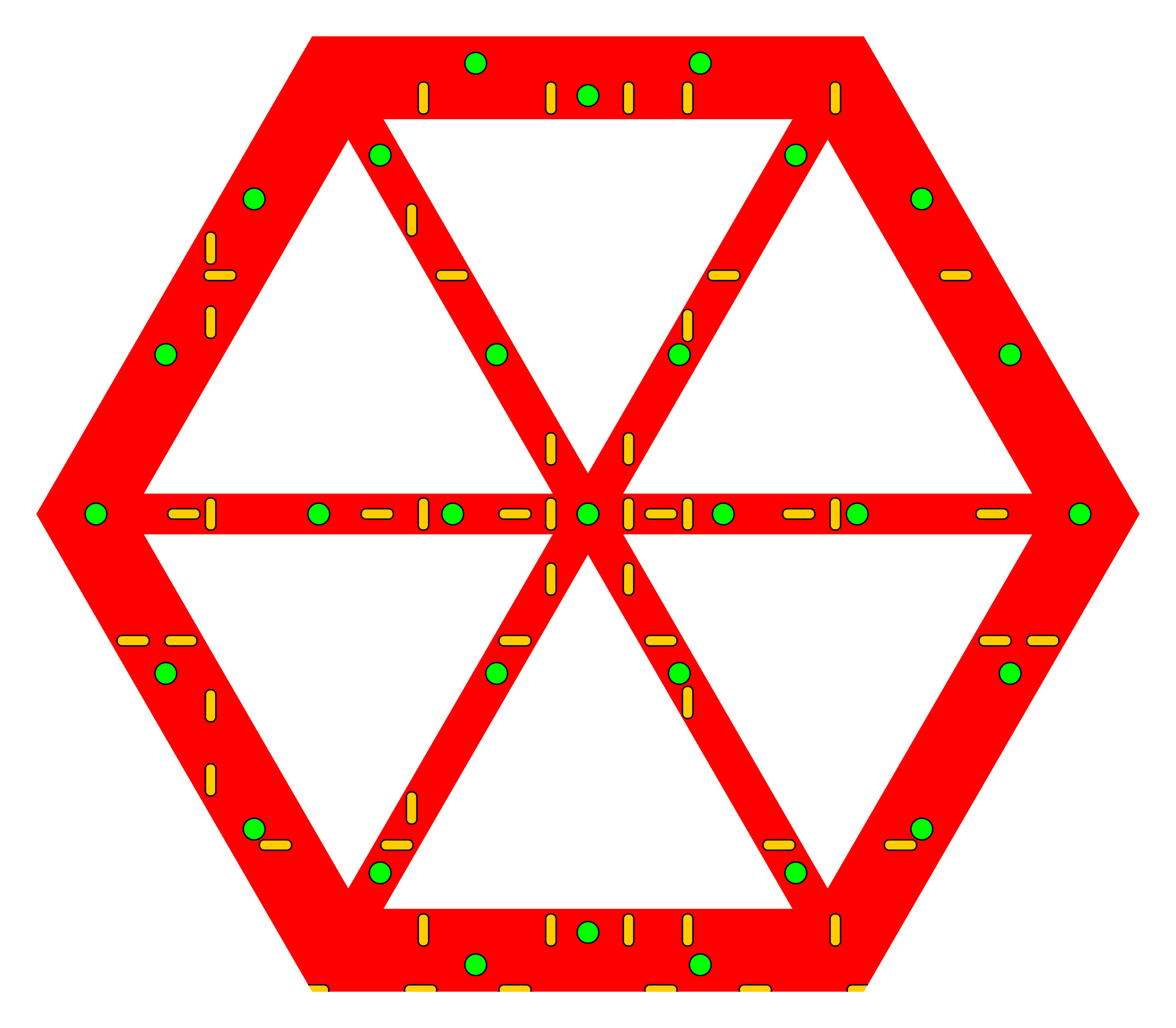 For the wide variety of panel positions on the hexagons, many different attachment points are needed on the exagon: The oval, yellow attachment points in the figure below serve to fix the lower edges of the panels directly to the hexagon. The green circles indicate attachment points for struts, leading to the upper edges of the panels.