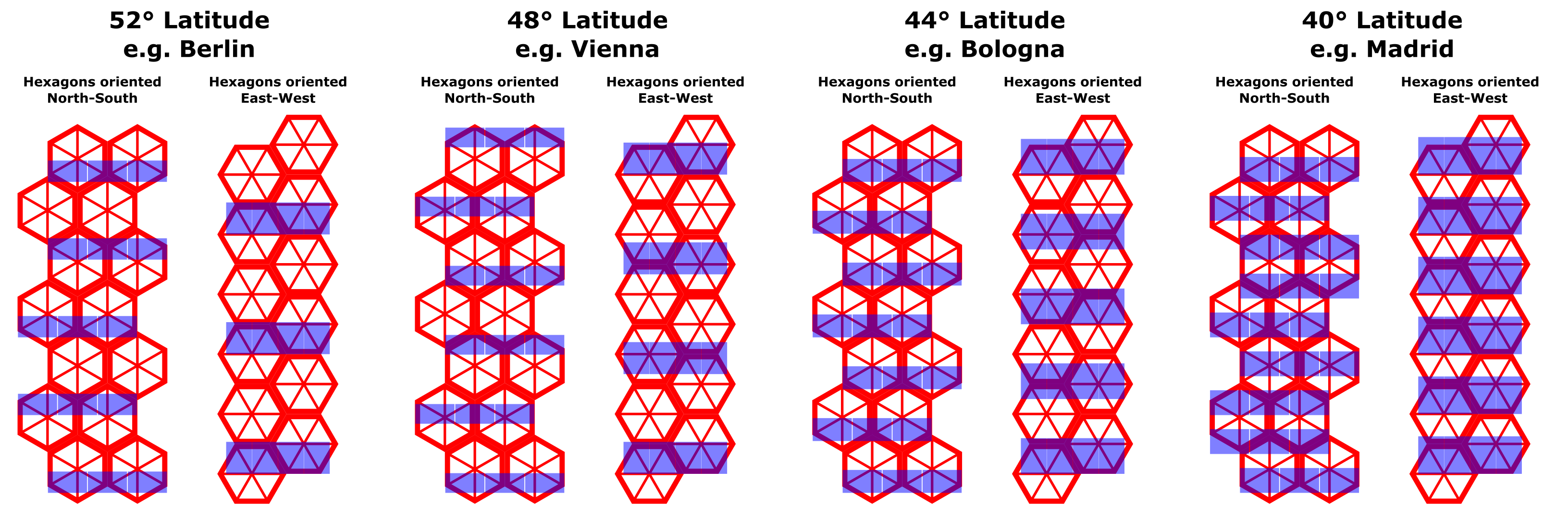 - If two edges of each hexagon are north-south oriented, the standard-sized photovoltaic panels (1,72 x 1,13 m) are aligned by their longer edge in east-west direction. With a roughly 4 cm gap between the panels, three panels fit to two hexagons.