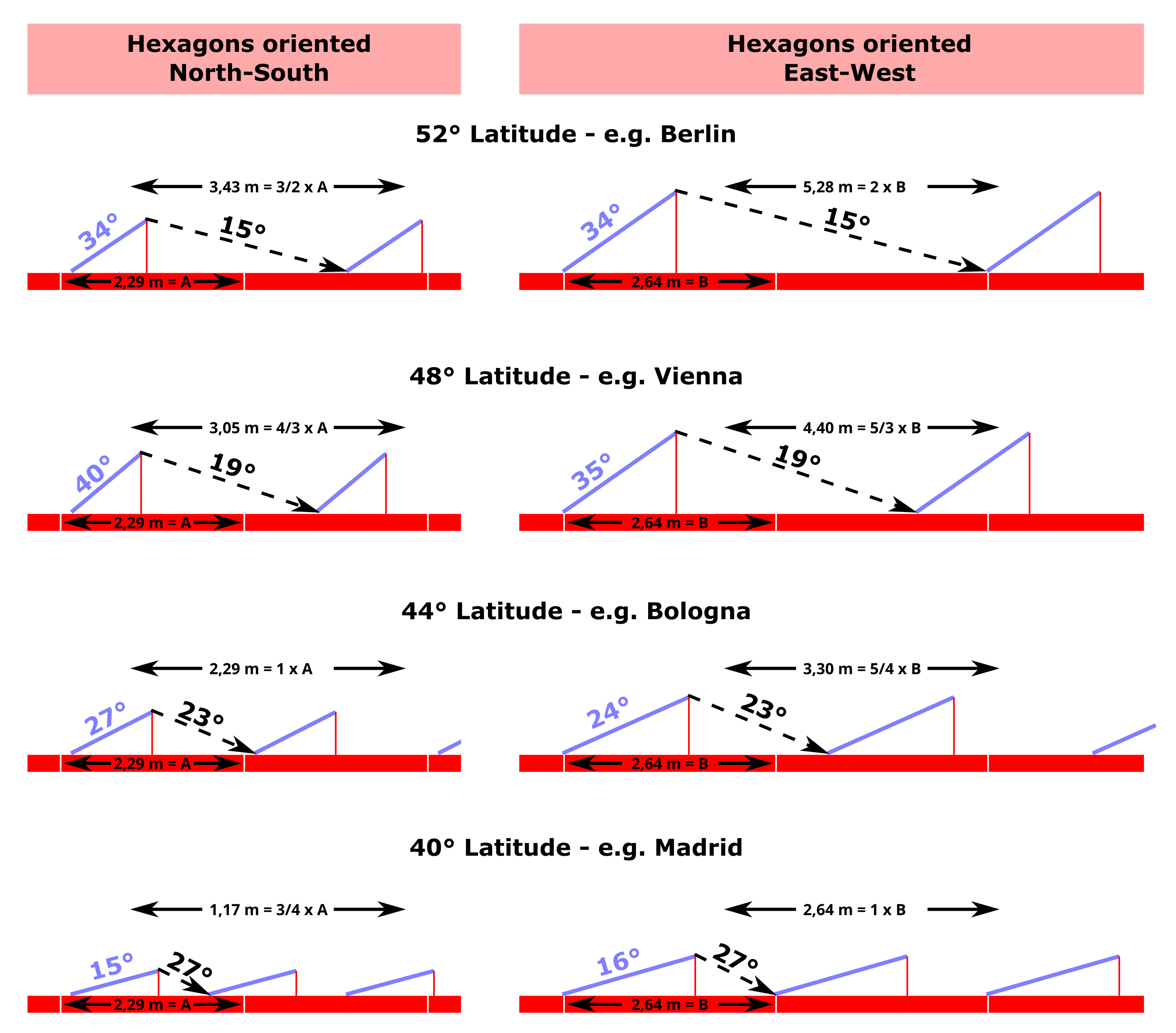 Along the north-south axis, the relationship between panel spacing and hexagon spacing depends on the latitude: The following two figures show combinations of panel inclination and panel spacing for different latitudes in Europe and for both orientations of the panel (short or long edge in east-west direction). With these combinations, there will be noch shadow of one panel on the next one even during the lowest solar altitude angle in late december at noon. Furthermore, for the two more northern examples, the minimum panel inclination is 30° to let snow reliably glide off the panels and to achieve more yield in winter.
