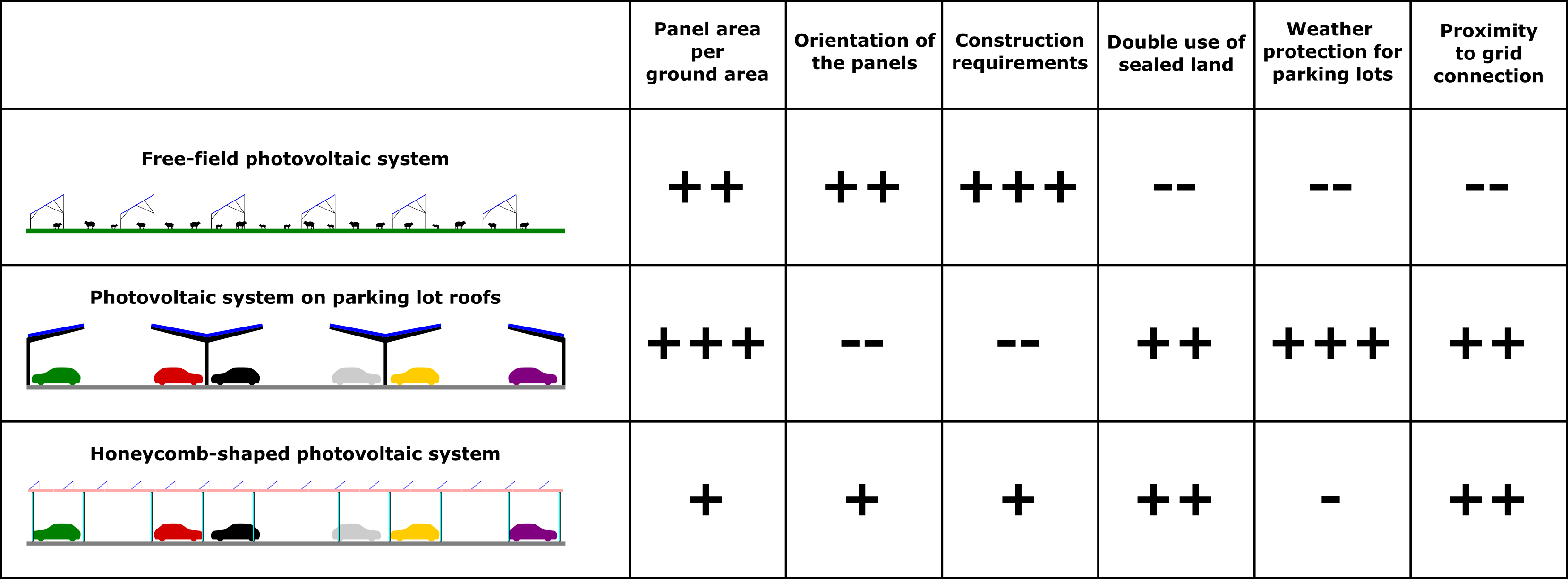 Compared to more conventional photovoltaic systems for parking lots with roofs and panels aligned to the parking pitches, the honeycomb-shaped system achieves much more efficient use of the individual panels, nearly as efficient as a free-field system. This means, that much fewer panels deliver only slighly lower yield. The construction carries significantly less load: a lower number of panels and no snow during winter. Following this criterion, the free-field ist still better too, because of less efforts for height and span width. Advantages of the honeycomb-shaped system are the proximity to grid connection (in particular within city limits or close to them) and double use of already sealed area without any reduction of the use of agricultural area. A disadvantage compared to more conventional solar roofs on parking lots is nearly no rain protection and limited sun protection for the parked vehicles.